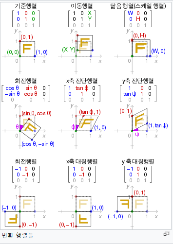 - 다음의 표준행렬(standard matrix)을 구성함으로써, 우리가 원하는 방식대로 동작하는 행렬변환 을 코딩할 수 있다