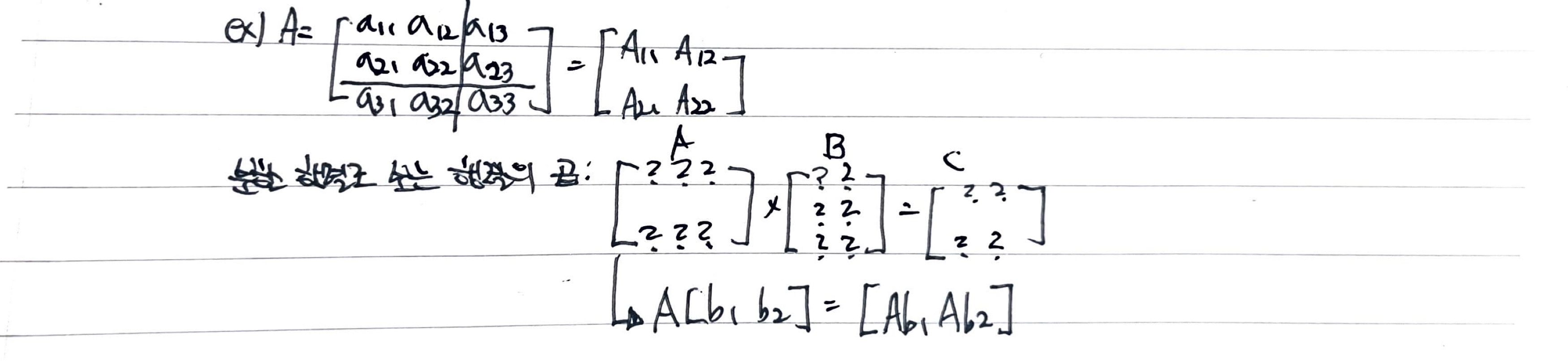 - 분할 행렬: 행렬을 몇개의 조각 단위로 분할하여 생각한 것