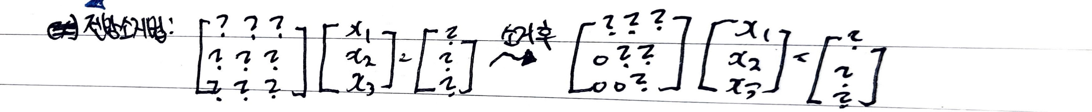- 전방소거법: 주어진 선형시스템을 아래로 갈수록 더 단순한 형태의 선형방정식을 가지도록 변형
